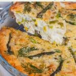 - Assemble — Transfer the cooked vegetables to the prepared dish and allow them to cool slightly. Pour the custard over the vegetables, gently lifting and redistributing with a fork to ensure even coverage. Top with the reserved asparagus tips and fresh dill.