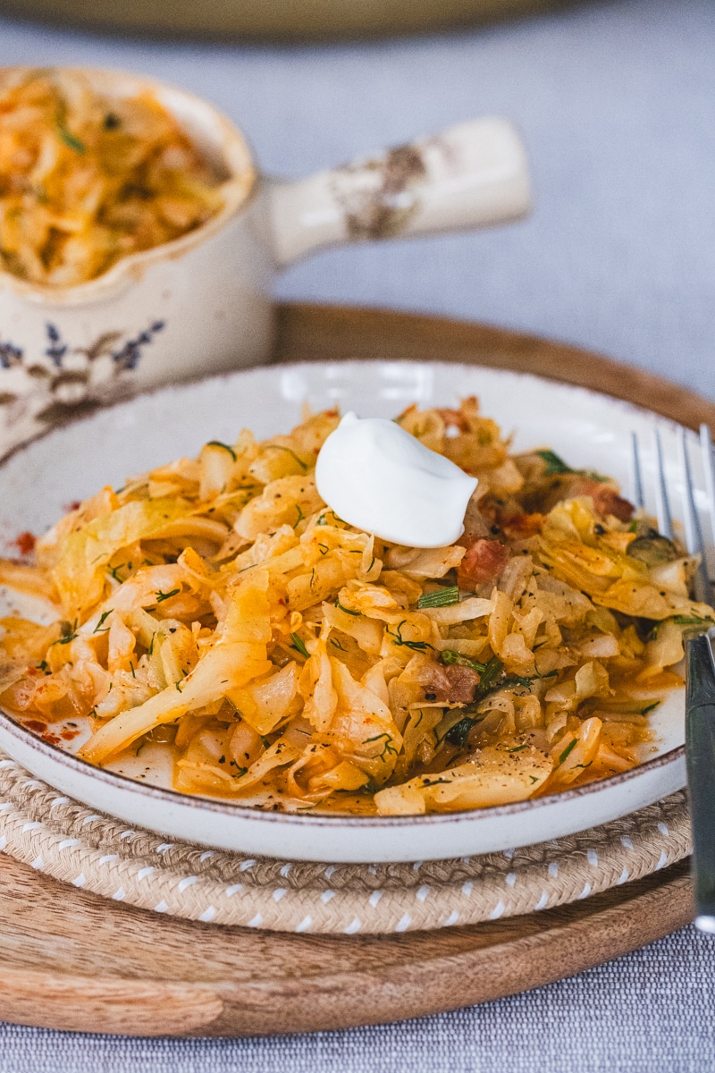 This rustic, Eastern European slow-cooked cabbage is one of my all-time favorite comfort dishes. It’s deeply nourishing, surprisingly simple to make, and relies on just a handful of humble ingredients that transform into something truly special. Naturally sweet cabbage, gently cooked until soft and silky, takes on a subtle smokiness from the bacon and a bright, fresh finish from generous handfuls of dill.
